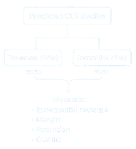 Clean design: value-stratified randomization (e.g., by predicted CLV deciles), holdouts, and guardrails to avoid contaminated conclusions.